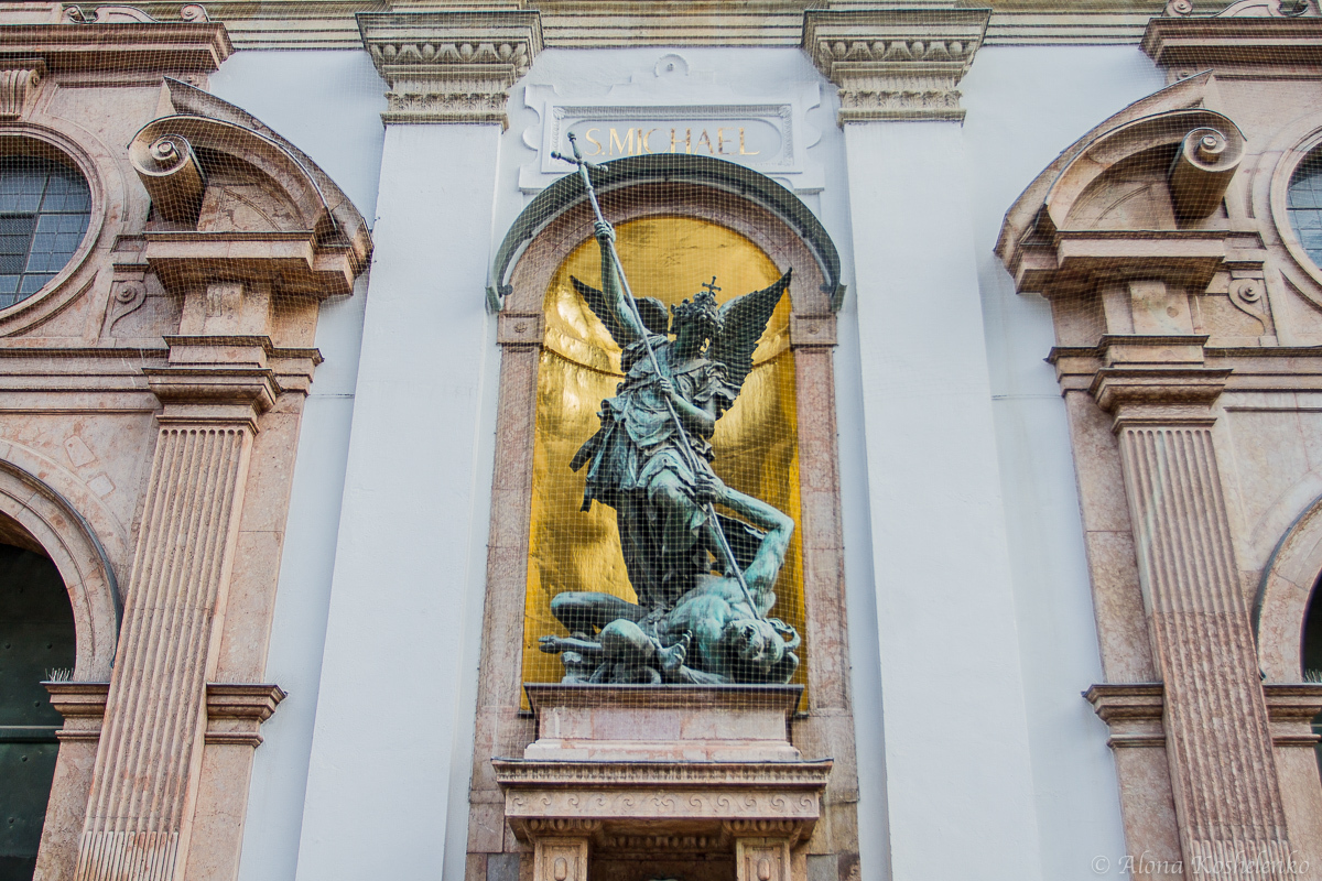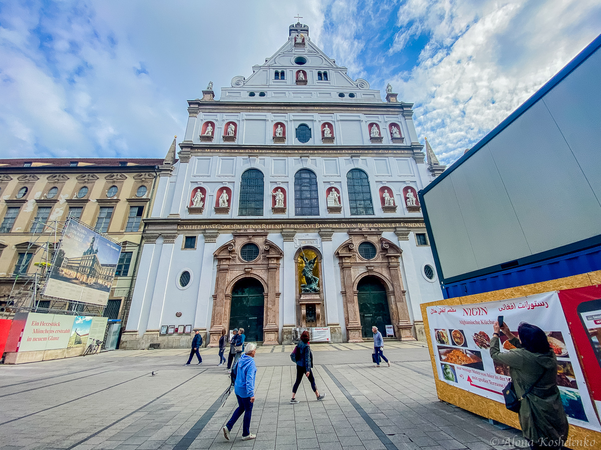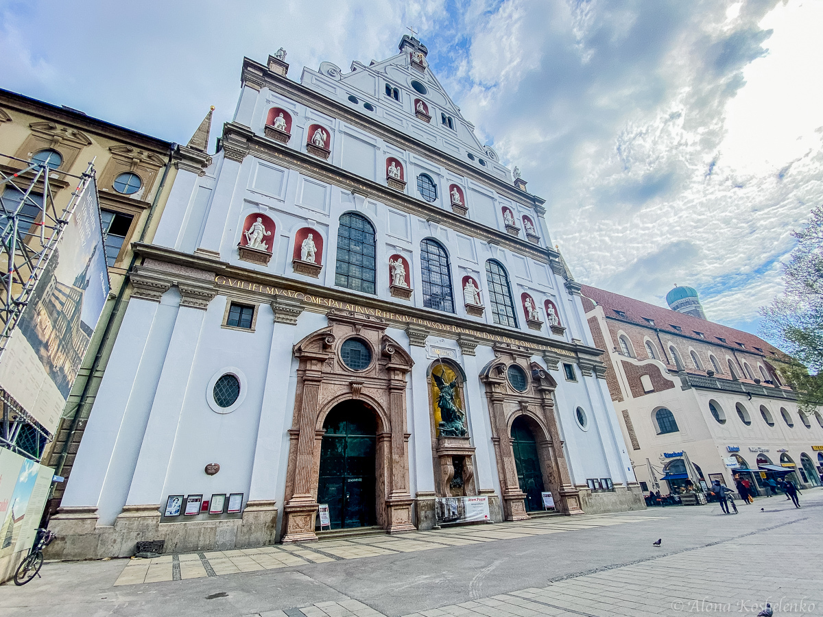Церковь Св. Михаила огромна, её белый остроугольный фасад всего на 6 м ниже купола собора Св. Петра в Риме. В нишах стоят 15 статуй баварских правителей рода Виттельсбахов, над ними возвышается фигура Христа.