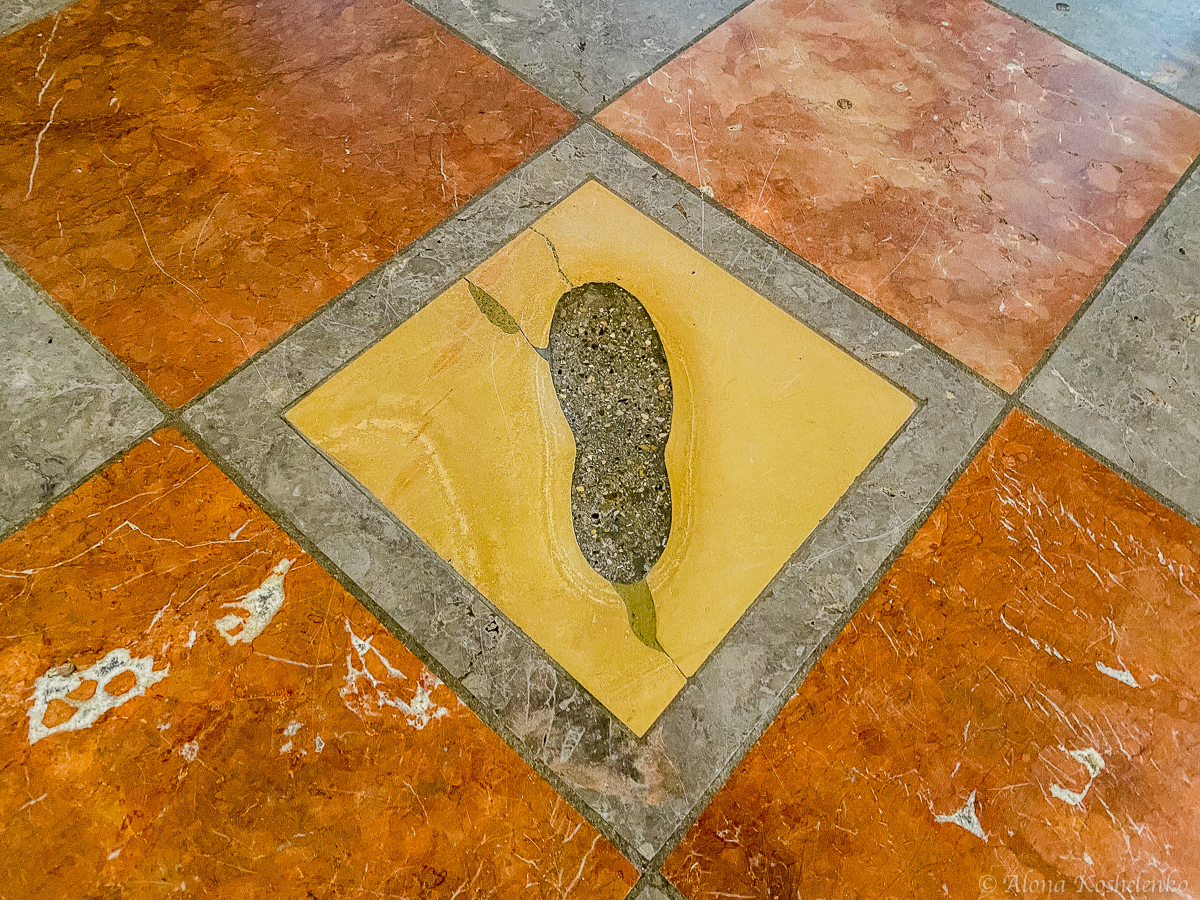 Первая легенда гласит, что до освящения собора туда прокрался дьявол. Заручившись поддержкой северного штормового ветра, он задумал разрушить храм. Войдя в него, он поразился. Недоумение нечистого вызвало отсутствие окон. "Какой же прихожанин станет молиться в церкви, в которой нет ни одного окна!" — воскликнул он и на радостях топнул ногой. На этом месте остался след, а дьявол провалился сквозь землю.