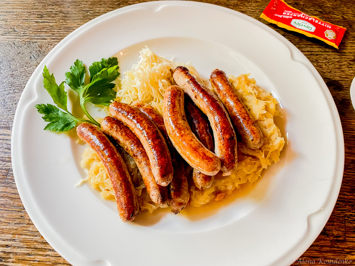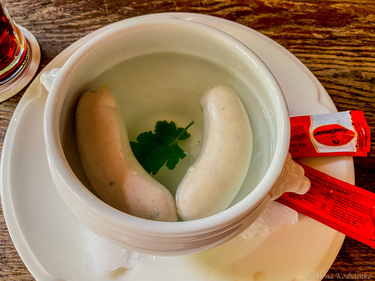 Мы не стали шокировать нашего строго официанта и заказали баварские блюда: мюнхенские белые колбаски и сосиски-гриль с кислой капустой.