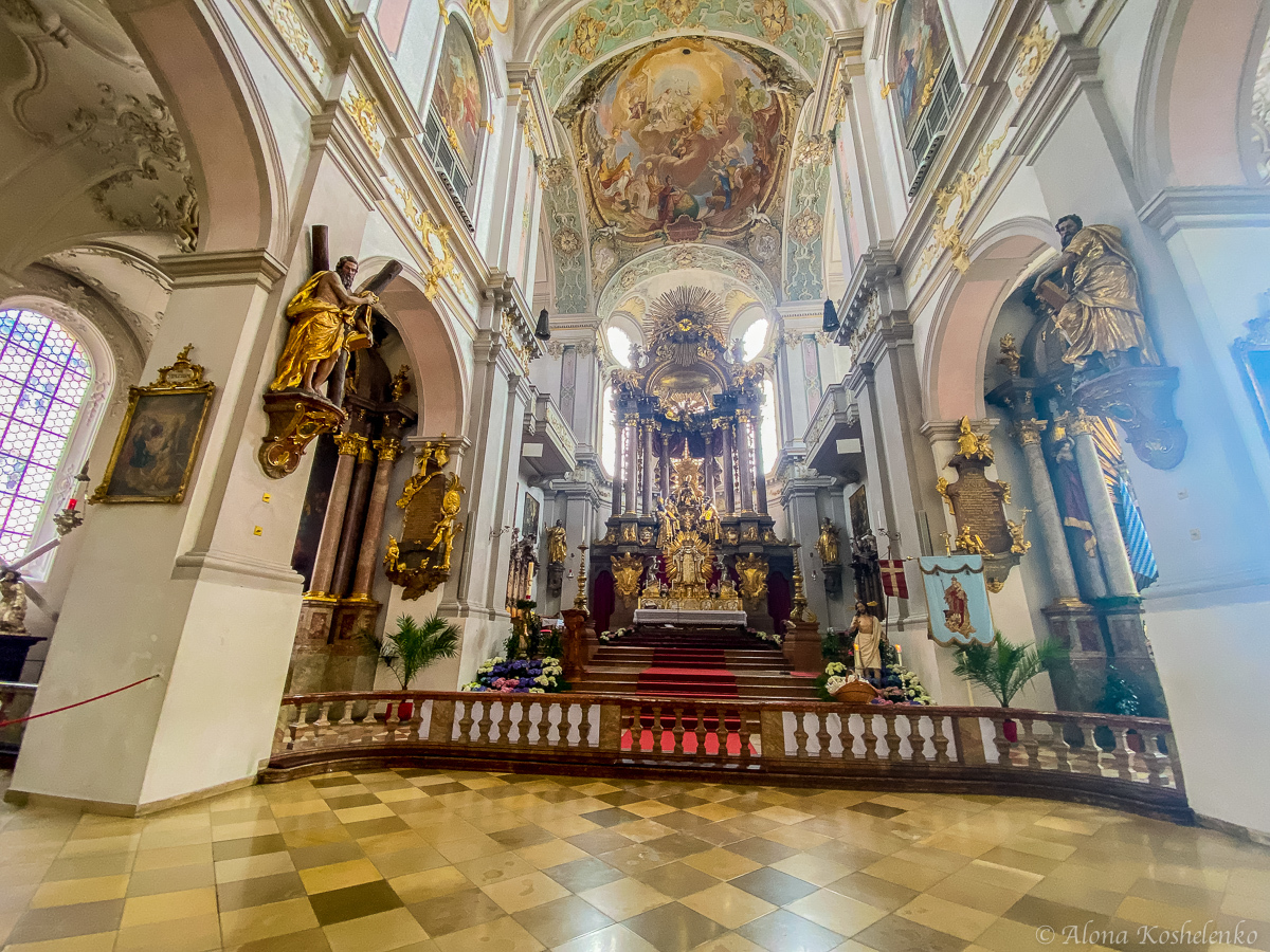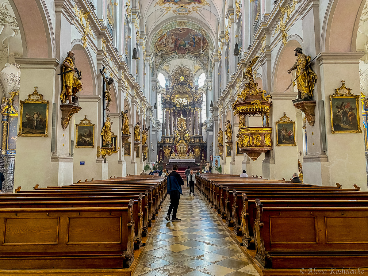 Интерьеры Петерскирхе вполне подходят на роль учебника по истории архитектуры. Его жемчужины — барочный алтарь XVIII века из резного дерева с позолотой, посвящённый святому Петру (стоит обратить особое внимание на прекрасный ореол над головой апостола)